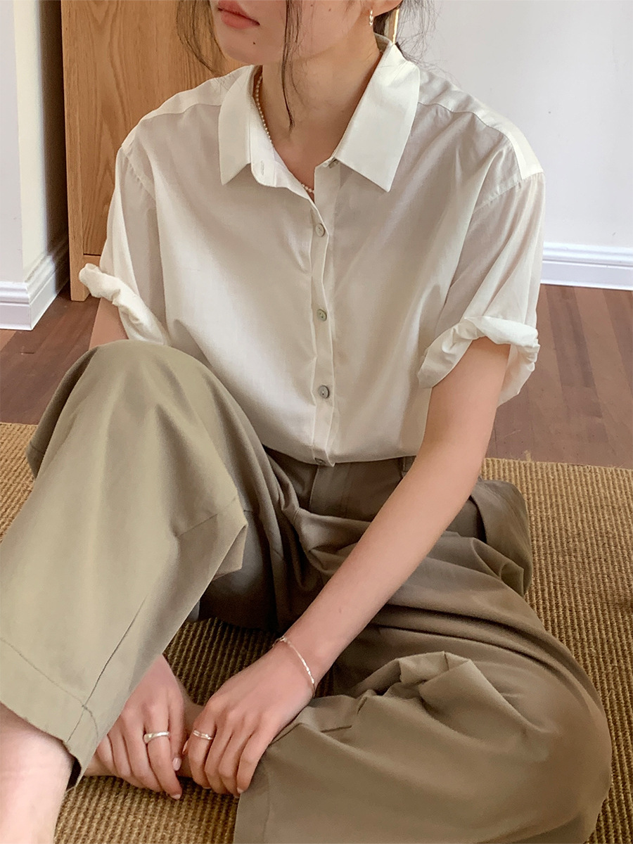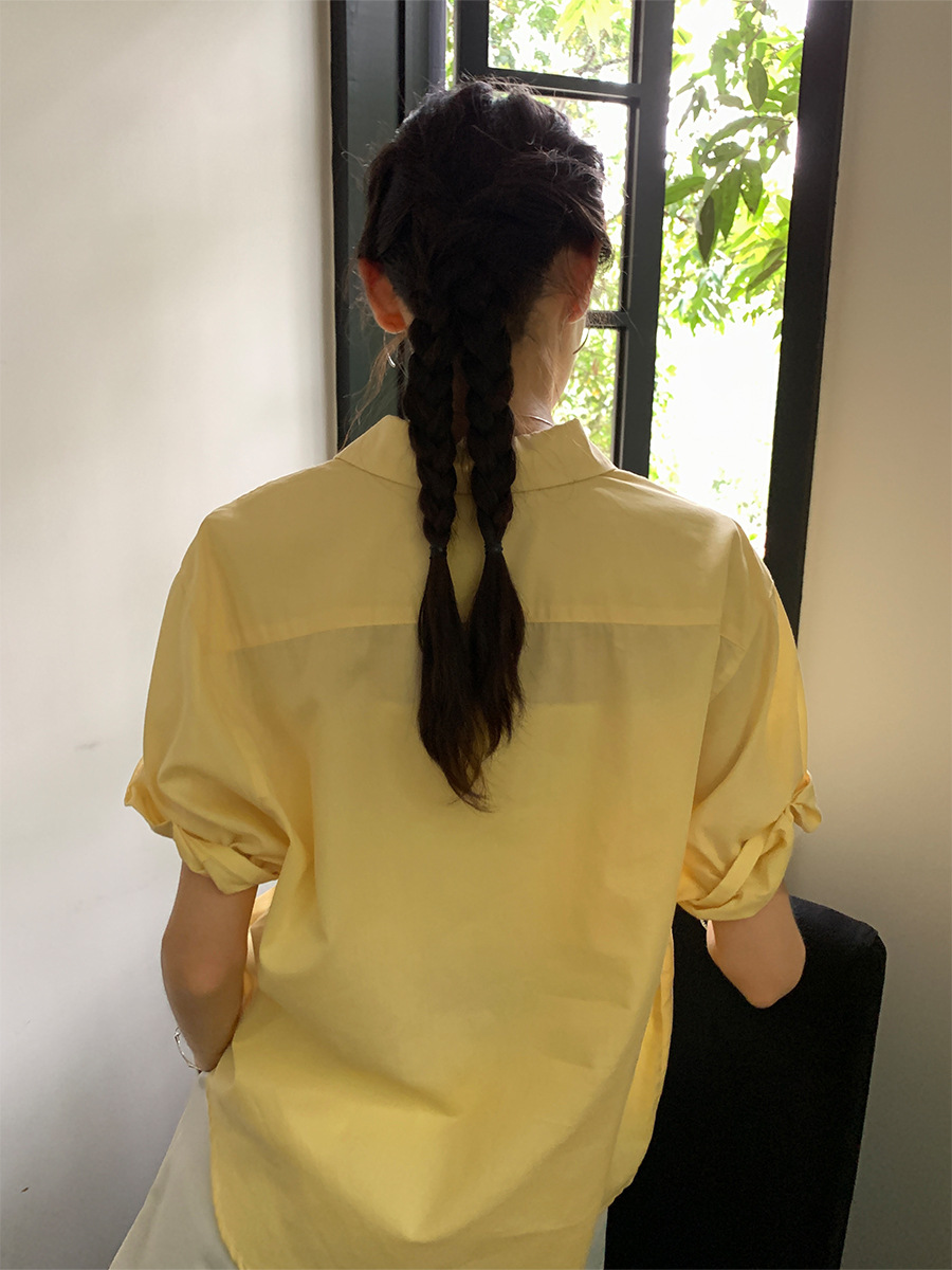 Solid color versatile lapel short sleeved rolled edge shirt for women